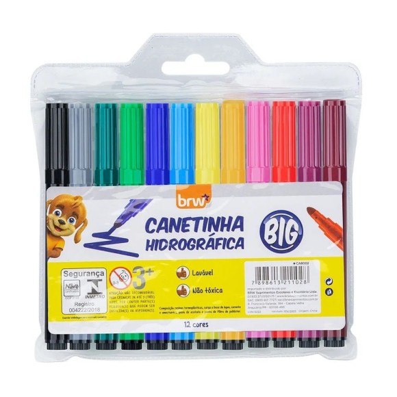 A Caneta Hidrocor 12 Cores Jumbo da BRW é um conjunto de canetas coloridas com corpo grosso, ideal para crianças e para quem busca conforto ao usar.