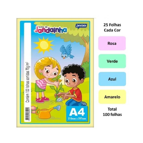 Papel Sulfite A4 75g 100 Folhas Cores Sortidas Jandainha ideal para impressão, trabalhos escolares, desenho, pintura, recorte e colagem.